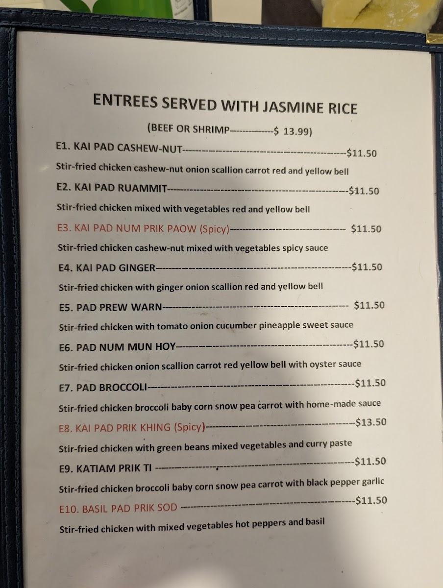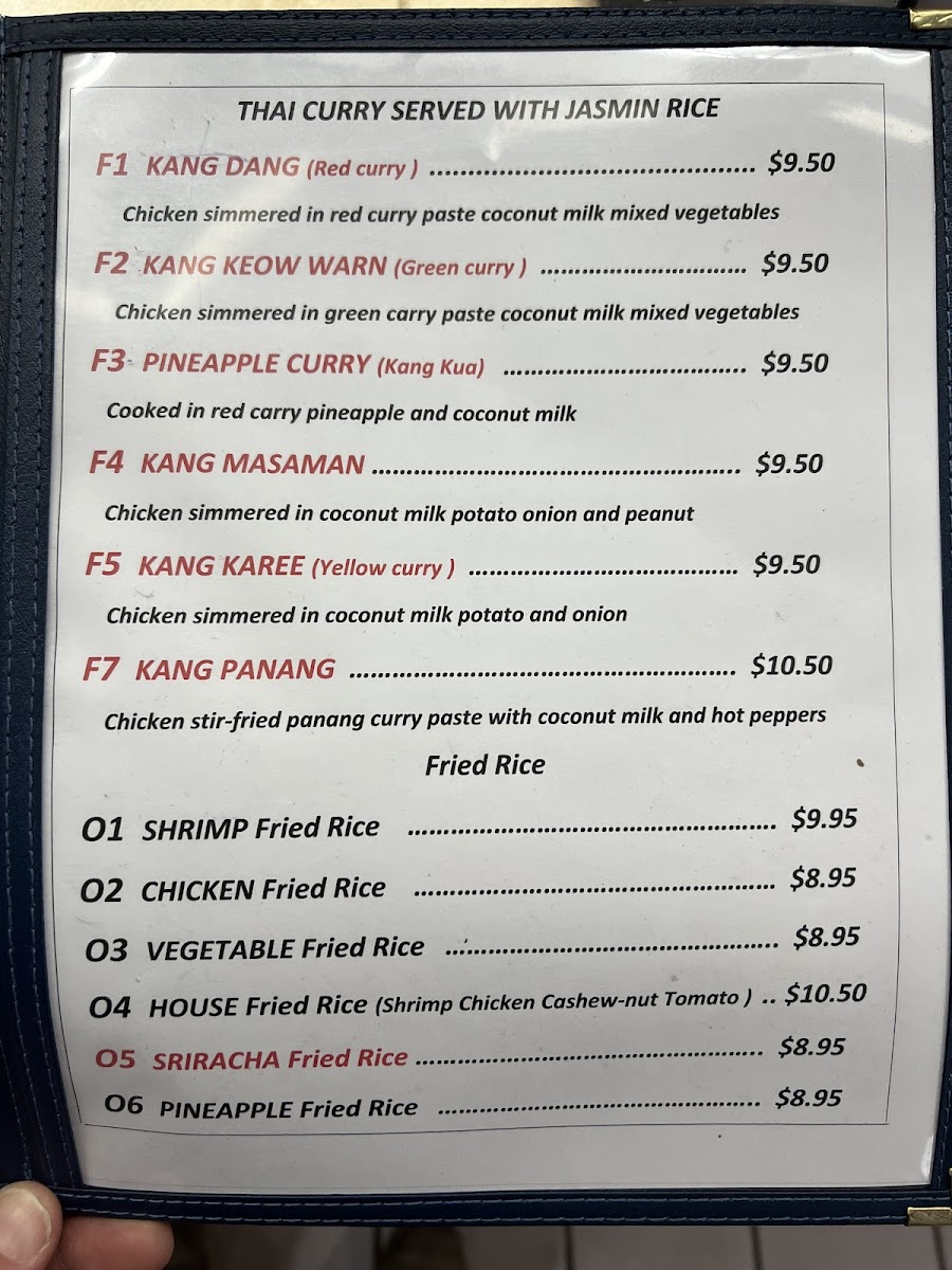 Menu highlights include comforting options like mango sticky rice for a subtly sweet finish, crab rangoon as a shared treat, and spicier dishes like the extra-hot stir fry ginger chicken for those seeking a bit more heat. The variety caters both to those new to Thai cuisine and to regular visitors looking for dependable, satisfying meals.